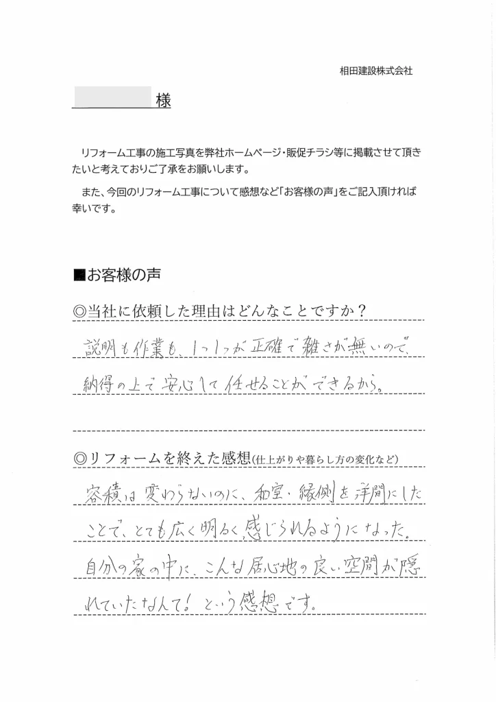 容積は変わらないのに、和室・縁側を洋間にしたことでとても広く明るく感じられるようになりました。自分の家にこんな居心地の良い空間が隠れていたなんて!という感想です。