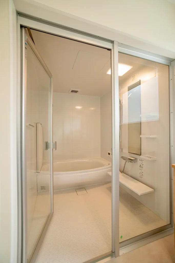 洗面とつながる、明るい浴室