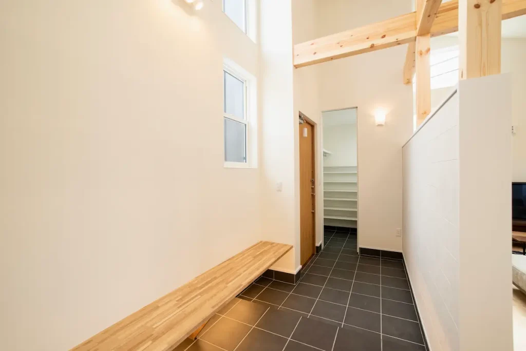 黒いタイルの土間に、木のベンチがやさしく映える玄関。吹き抜けから光が落ち、縦の広がりと開放感を感じられます。