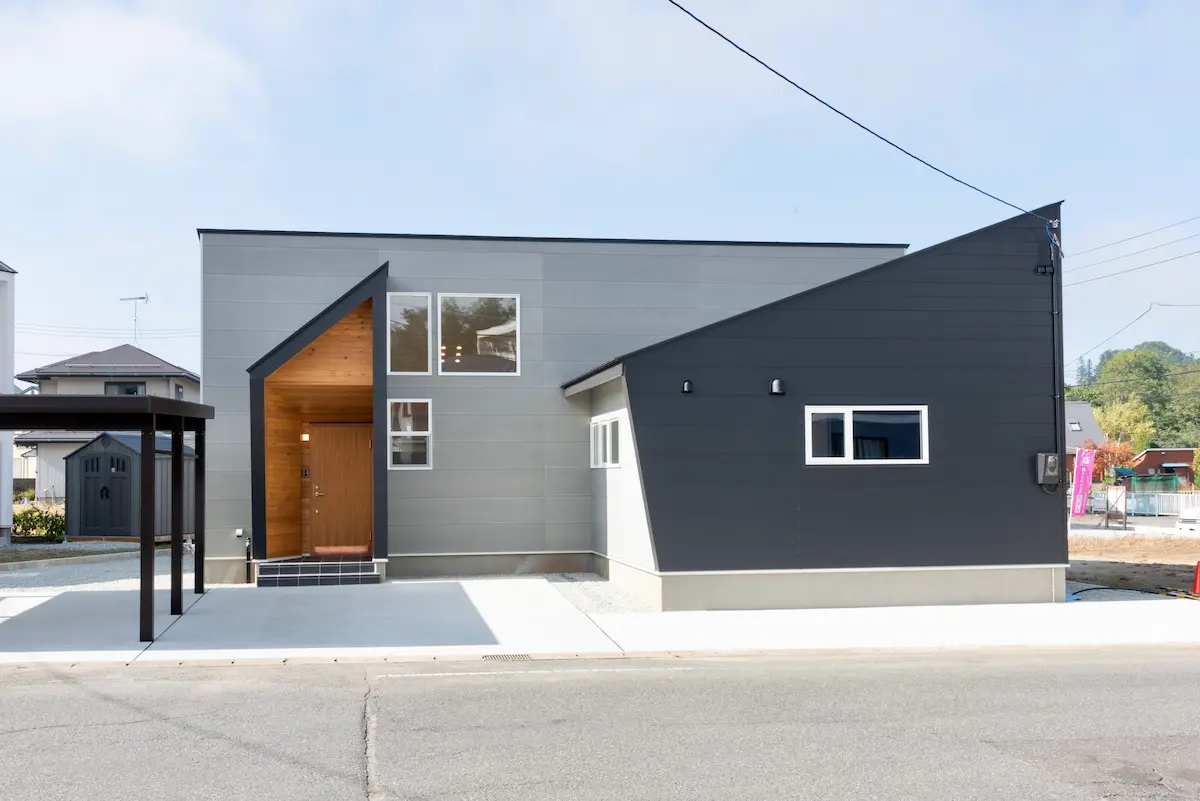 グレー×ブラックの張り分けで、建物の水平ラインを強調。木調の軒天を玄関まわりに効かせ、シンプルながら温かみのある佇まいに。