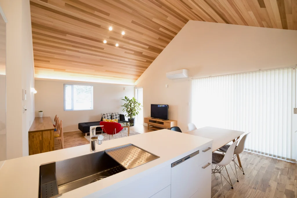 勾配天井の木目が空間の主役に。白い壁と合わせて、明るく開放的に仕上げました。