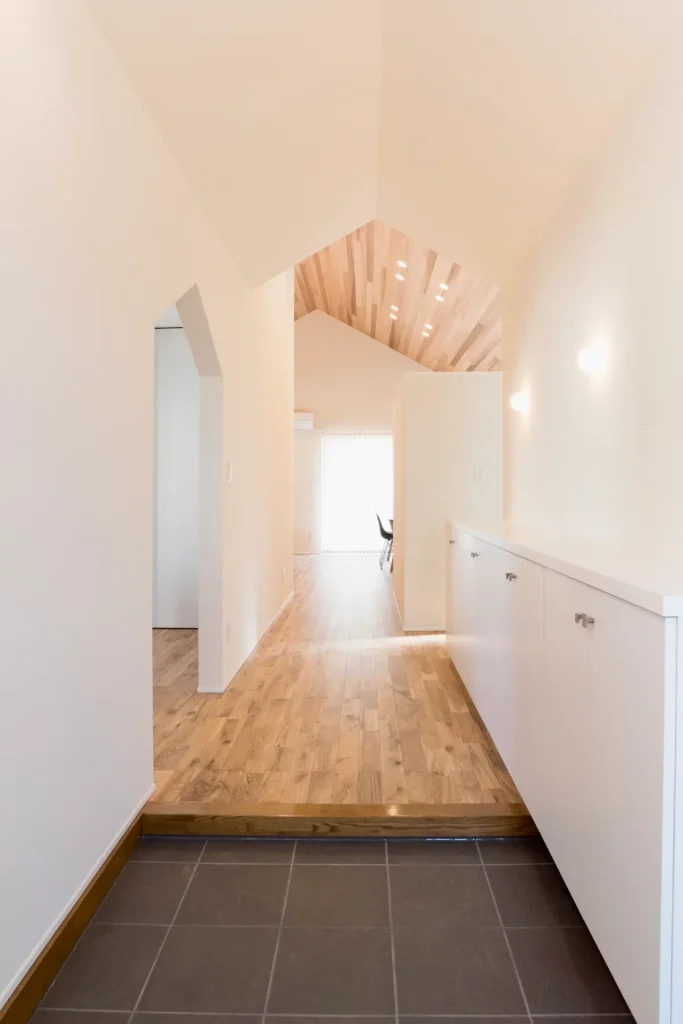 まっすぐ伸びる動線とやわらかな光で、開放感のある玄関に仕上げました。