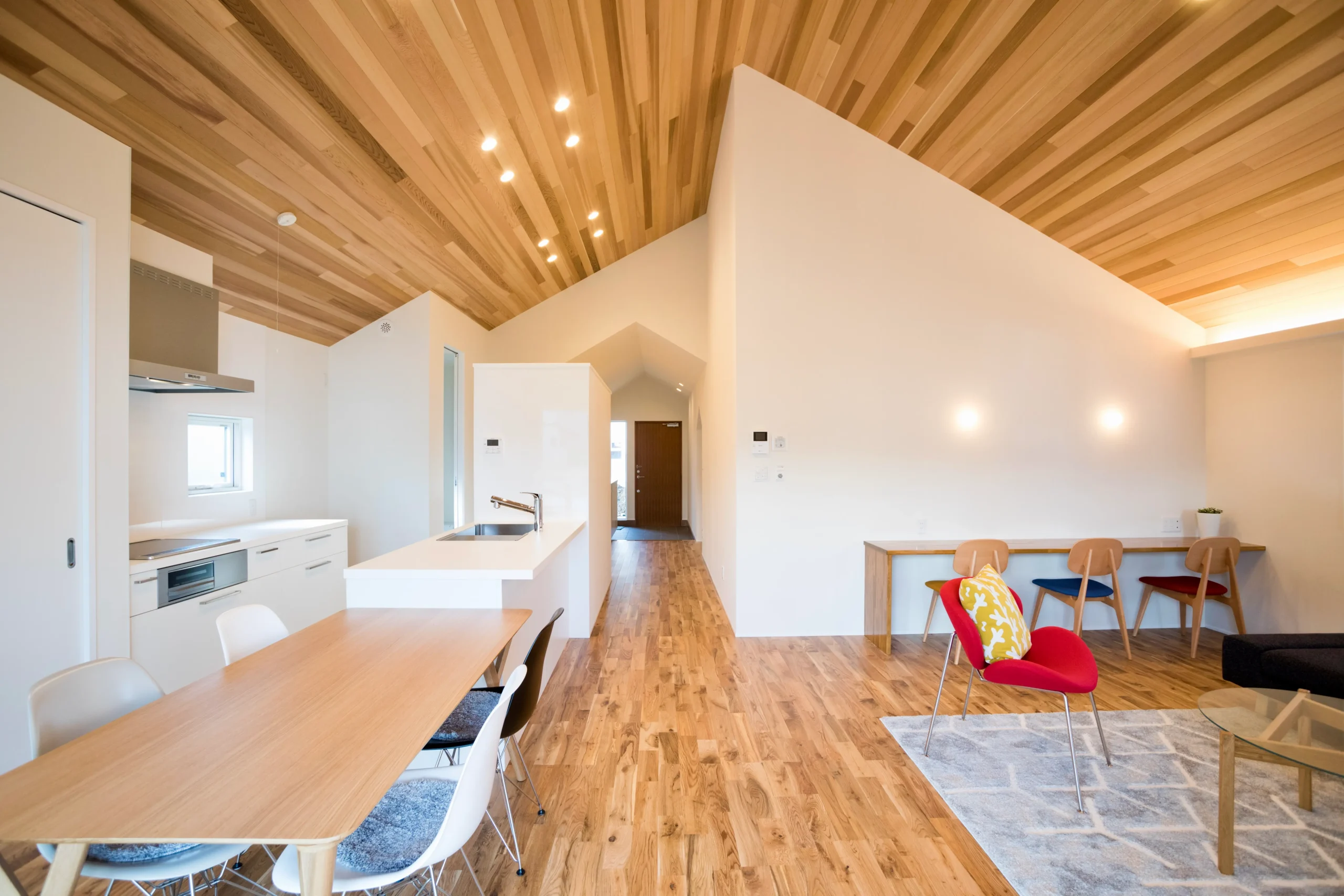 勾配天井の木目が空間の主役に。白い壁と合わせて、明るく開放的に仕上げました。