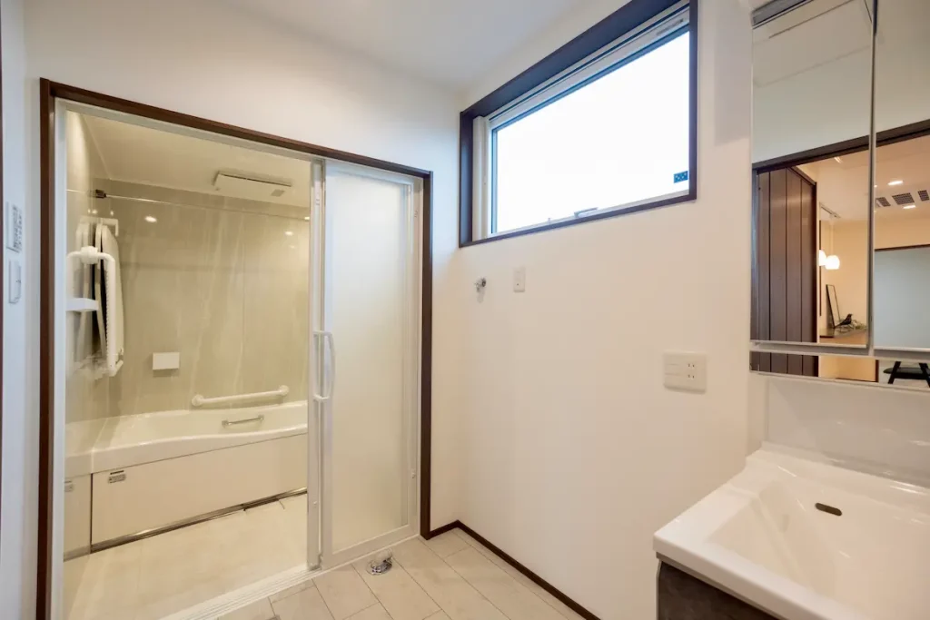 白をベースにまとめた洗面室は、空間が広く見えるのも魅力。鏡まわりもシンプルに整え、清潔感のある印象に仕上げました。