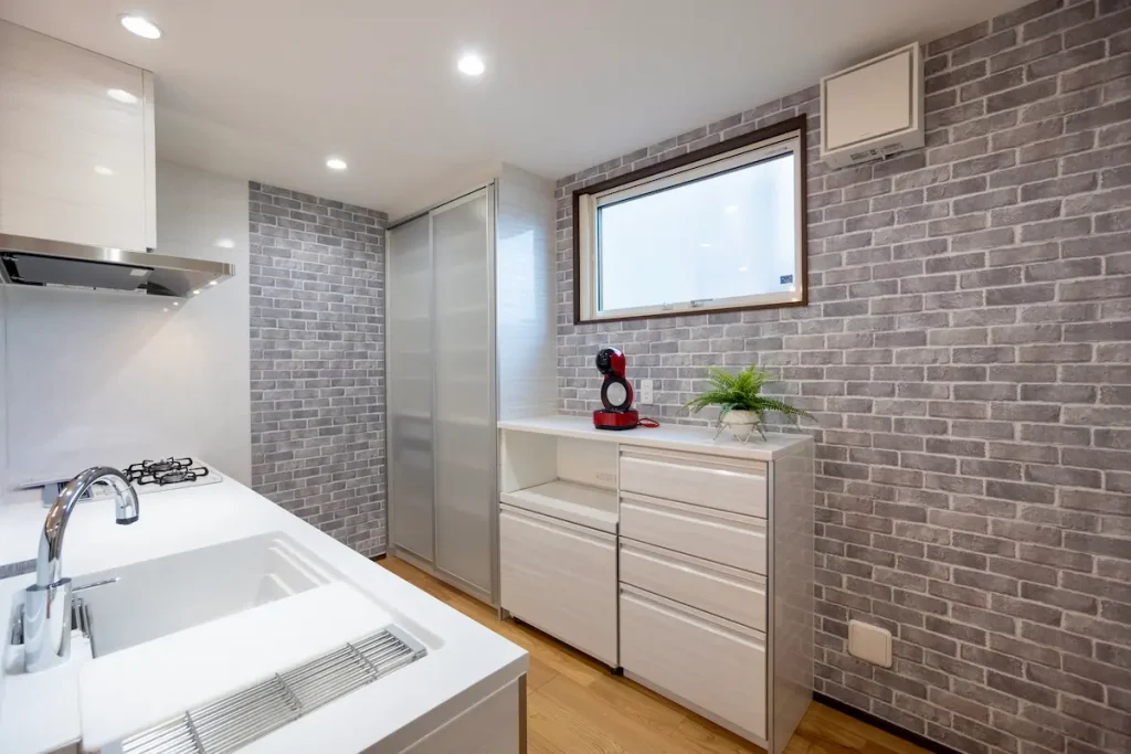 白いワークトップとグレーの壁がほどよく引き締まった空間。窓から光を取り込み、手元が明るく使いやすいキッチンに仕上げました。