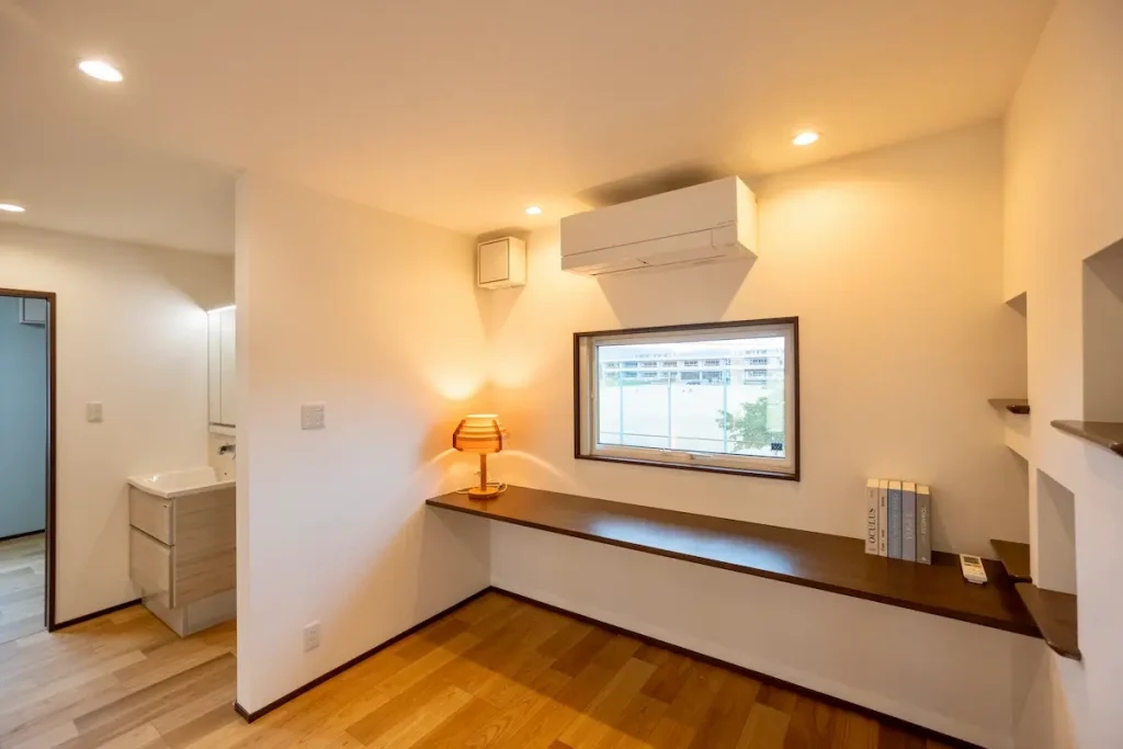 縦長窓と大きな窓を組み合わせ、日中はやわらかな明るさに包まれる一室。白い壁と木の床が、すっきり清潔な印象をつくります。