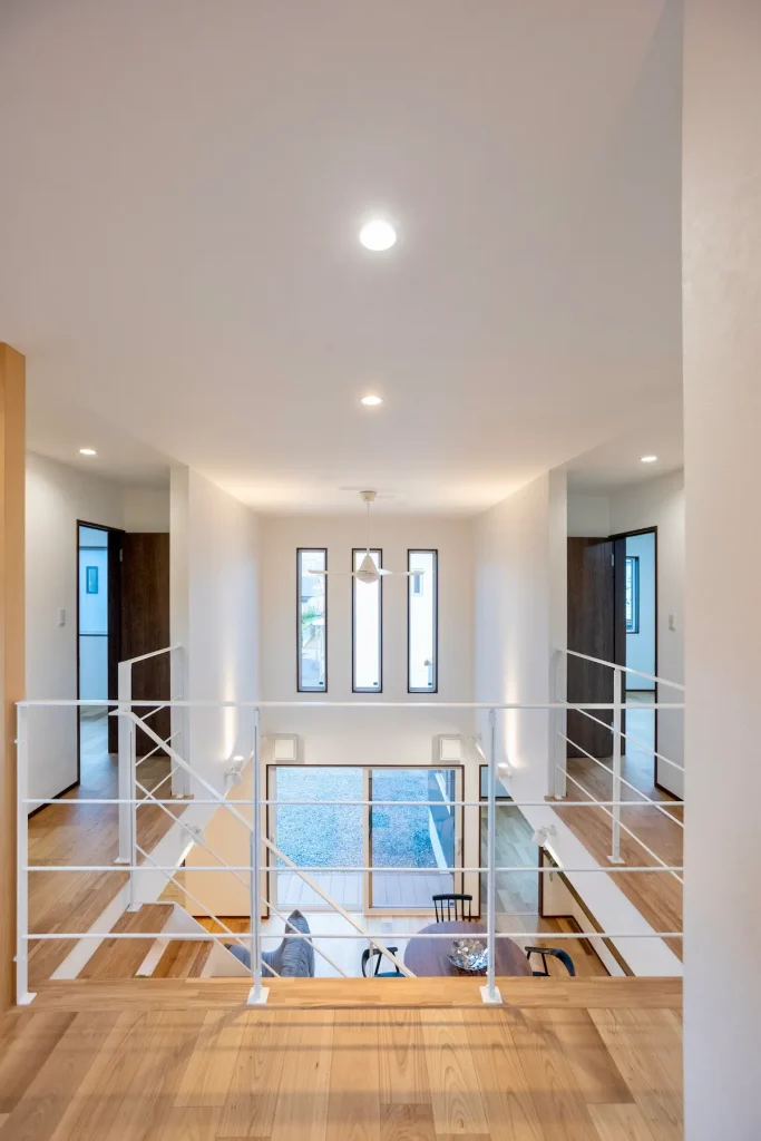 吹き抜けに面したホールから、明るさが家全体に広がります。縦長窓が視線を整え、すっきりとした印象に。