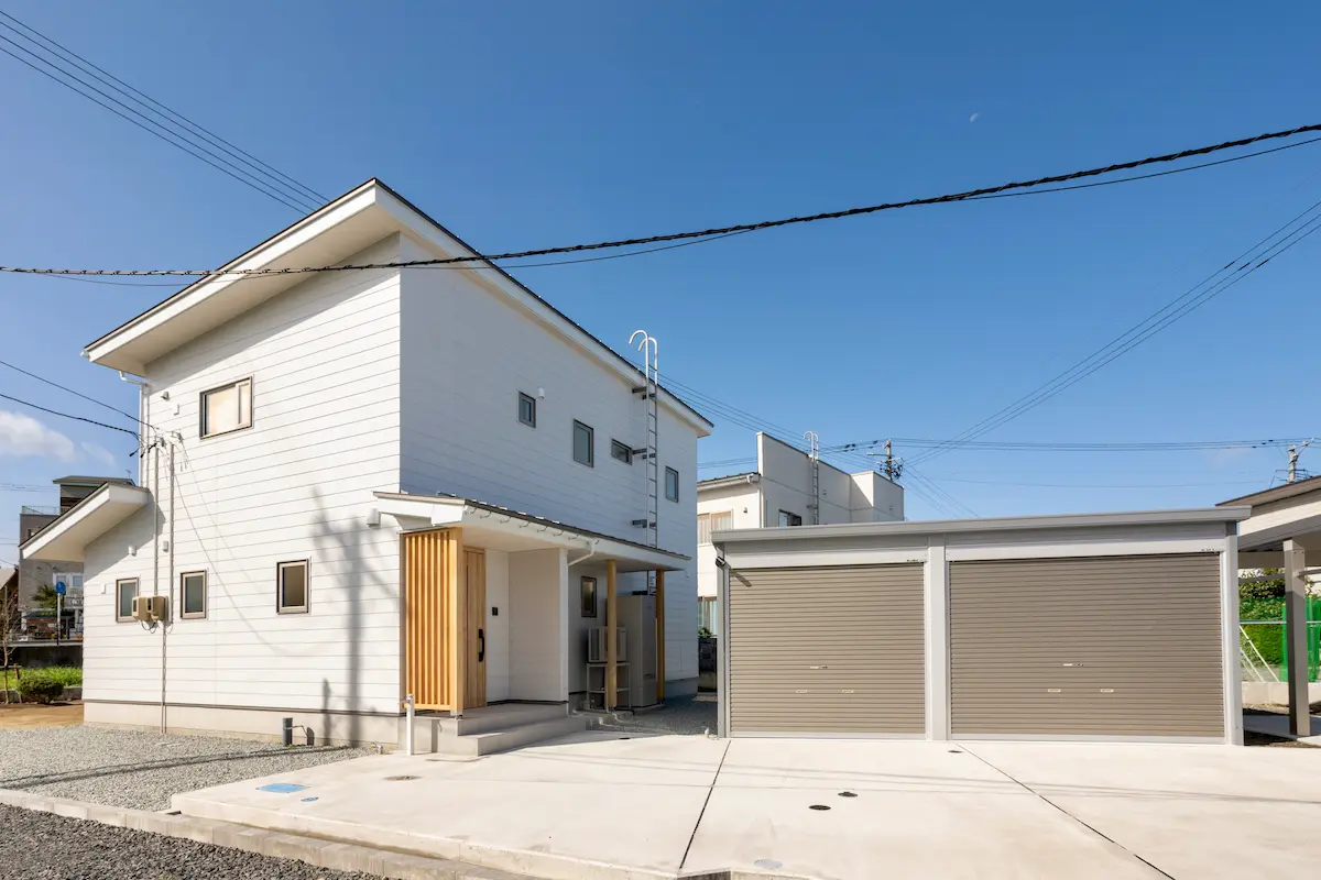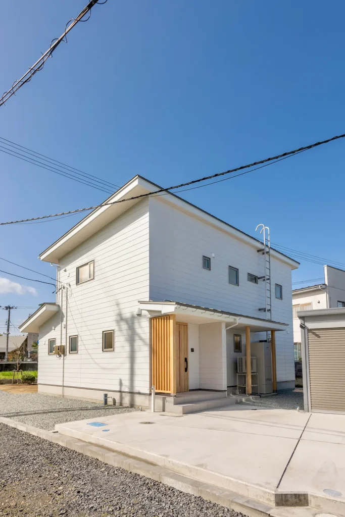 切妻屋根のシンプルな形に、玄関の木格子がやさしいアクセント。白×木で清潔感のある佇まいに仕上げました。