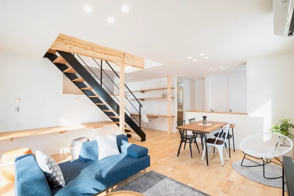 黒い鉄骨階段と木の素材感が、空間のアクセントに