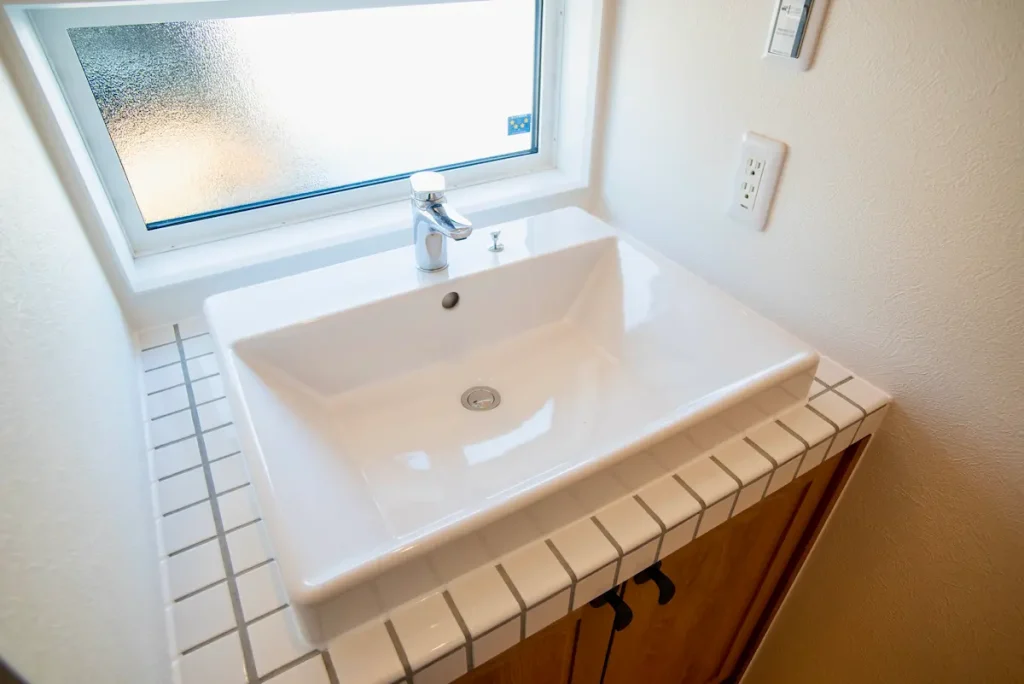 白いタイルと造作カウンターで、すっきり清潔感のある洗面に