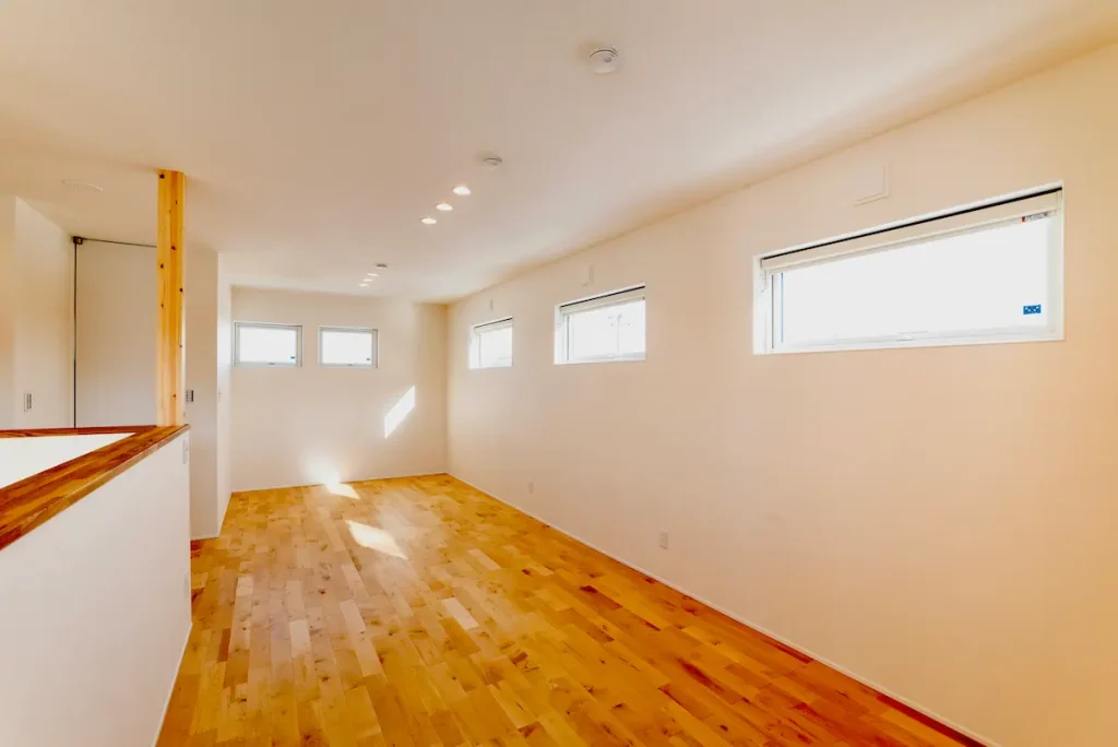 横長窓を並べて、やわらかな光が入る2階の部屋