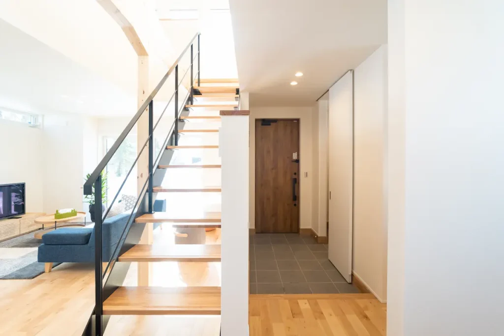 玄関からLDKへつながる設計。階段まわりをすっきりまとめ、開放感のある迎え入れに。