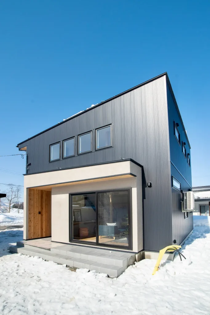 黒のガルバリウムに、白い塗り壁と木の玄関を組み合わせたシンプルな佇まい。横長窓が水平ラインを強調し、すっきりと見せます。