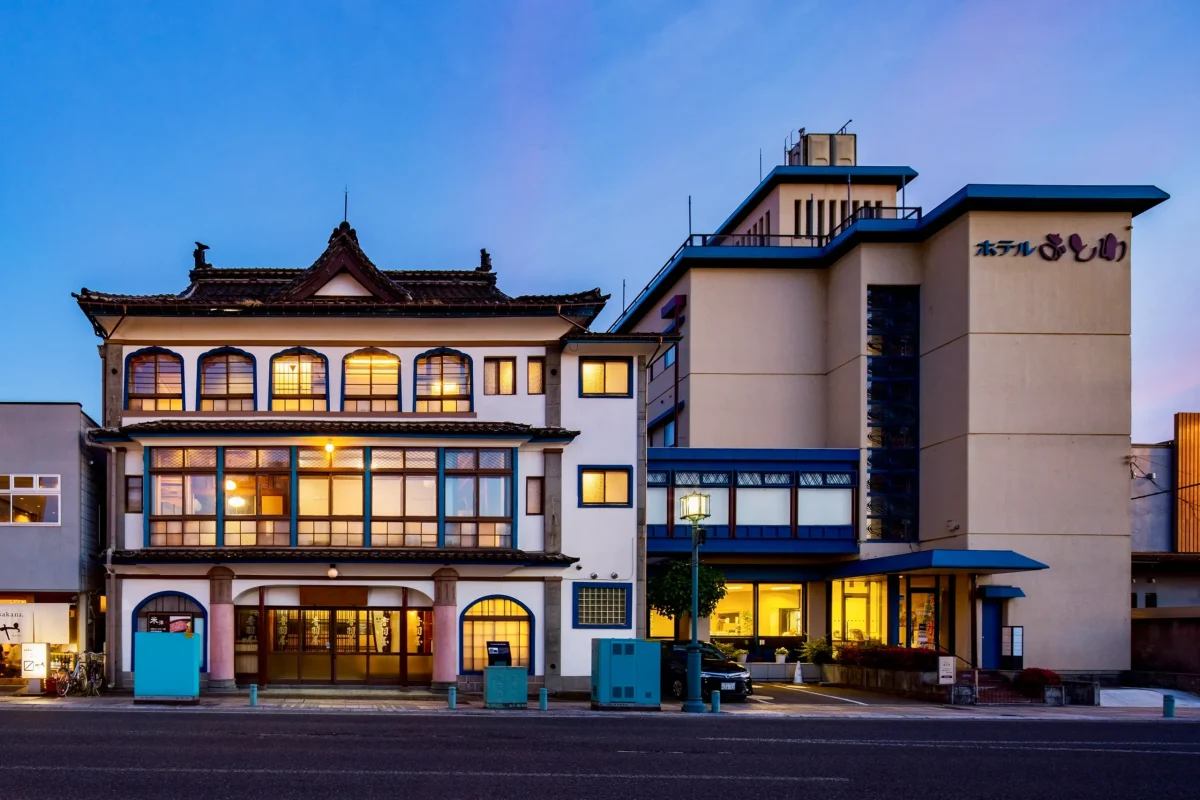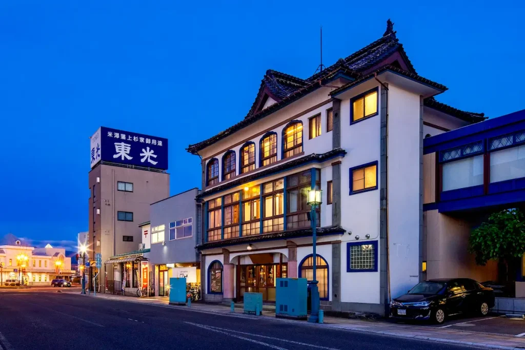夜間にはやわらかな灯りが街並みを照らし、米沢の風景に溶け込む落ち着いた佇まいを演出しています。